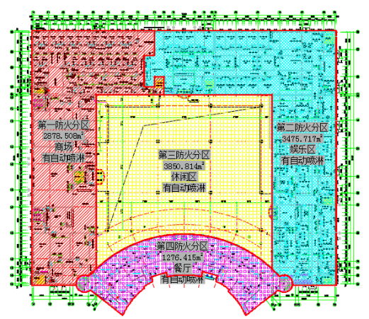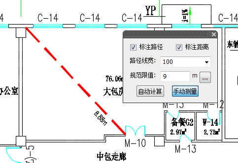建筑防火模块提供了部分建筑防火设计相关的功能,可按设置在图上快速生成防火分区标注,支持开洞、局部喷淋等细节设置;可计算从房间内最远点到疏散门以及从疏散门到安全出口的距离。