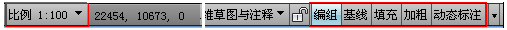 状态栏的比例控件可设置当前比例和修改对象比例,提供了编组、墙基线显示、加粗、填充和动态标注 (对标高和坐标有效) 控制。