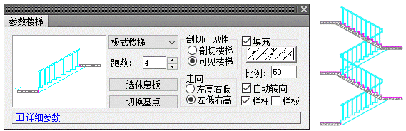除自动生成立剖面以外,程序还提供有独立的立剖面绘制编辑工具,如绘制剖面参数楼梯。
