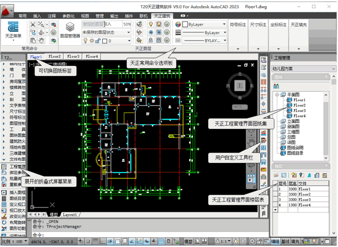 天正建筑引入了工程管理概念,工程管理器将图纸集和楼层表合二为一,将与整个工程相关的建筑立剖面、三维组合、门窗表、图纸目录等功能完全整合在一起,同时进行工程图档的管理,无论是在工程管理器的图纸集中还是在楼层表双击文件图标都可以直接打开图形文件。