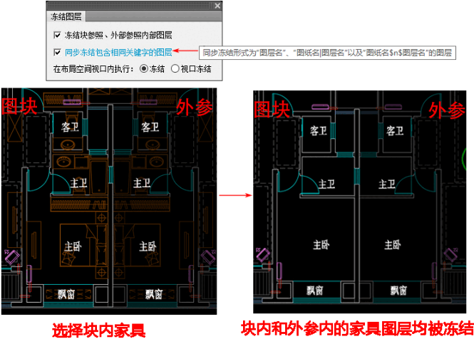 7)改进【图块改层】命令,在修改块内对象图层时支持直接修改块内对象线型为bylayer;