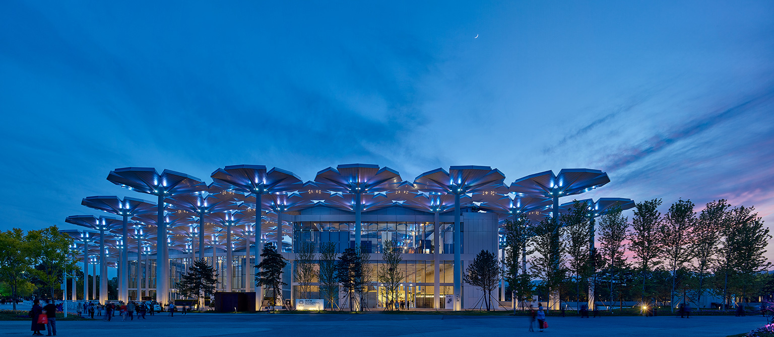 国际馆屋面为轮廓为球面,94朵花伞有94种造型,设计通过纵向压缩,将每4朵花伞统一为一个16.8X16.8矩阵网格,实现了对复杂造型的精确几何控制。漏斗形花伞利于雨水排放和收集利用,花伞上方覆盖光伏发电膜,体现绿色设计理念,花伞绚丽的夜景照明效果为2019北京世园会提供了最经典的记忆。