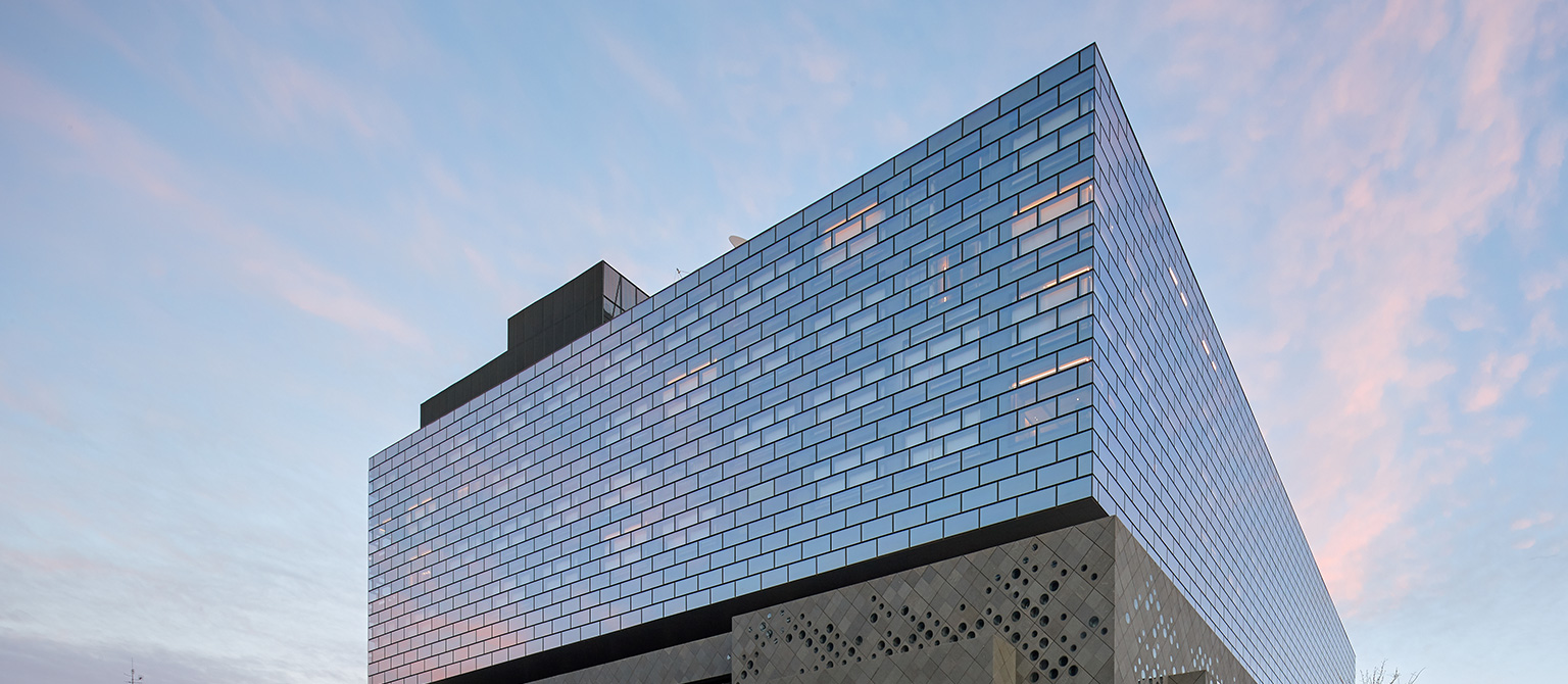 外幕墙首层至四层为菱形间隔单元式石材幕墙系统,上部4-8层外立面为错缝玻璃幕墙预制型小单元系统。圆形双面玻璃镜筒内置LED灯镶嵌在深灰色石材幕墙上,抽象的呈现了中国元代画家黄公望的富春山居图。