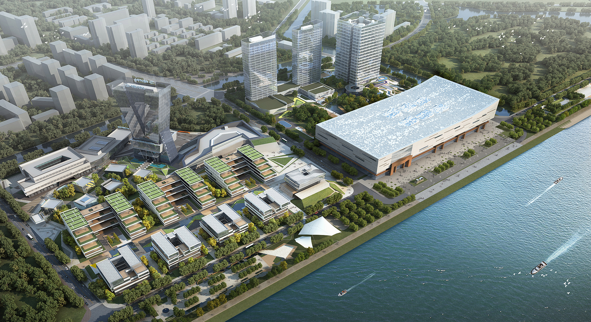 从城市规划布局及总体设计理念出发,充分体现数字科技精神与传统地域特色,建筑造型为水平向体量,“船头”微微起翘,建筑东侧100米高酒店为竖向体量,在两者体型关系整合下,呈现出汉代福船形态,契合“数字福船,乘风远航”的设计理念。